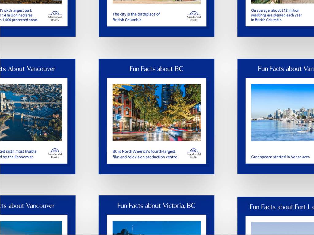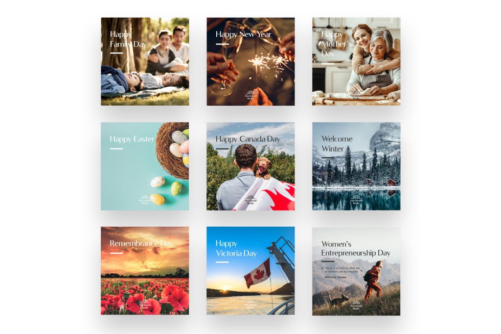 This social media toolkit includes various categories such as holidays, home design tips, fun facts, and Macdonald Realty’s history, all ready for agents to share!