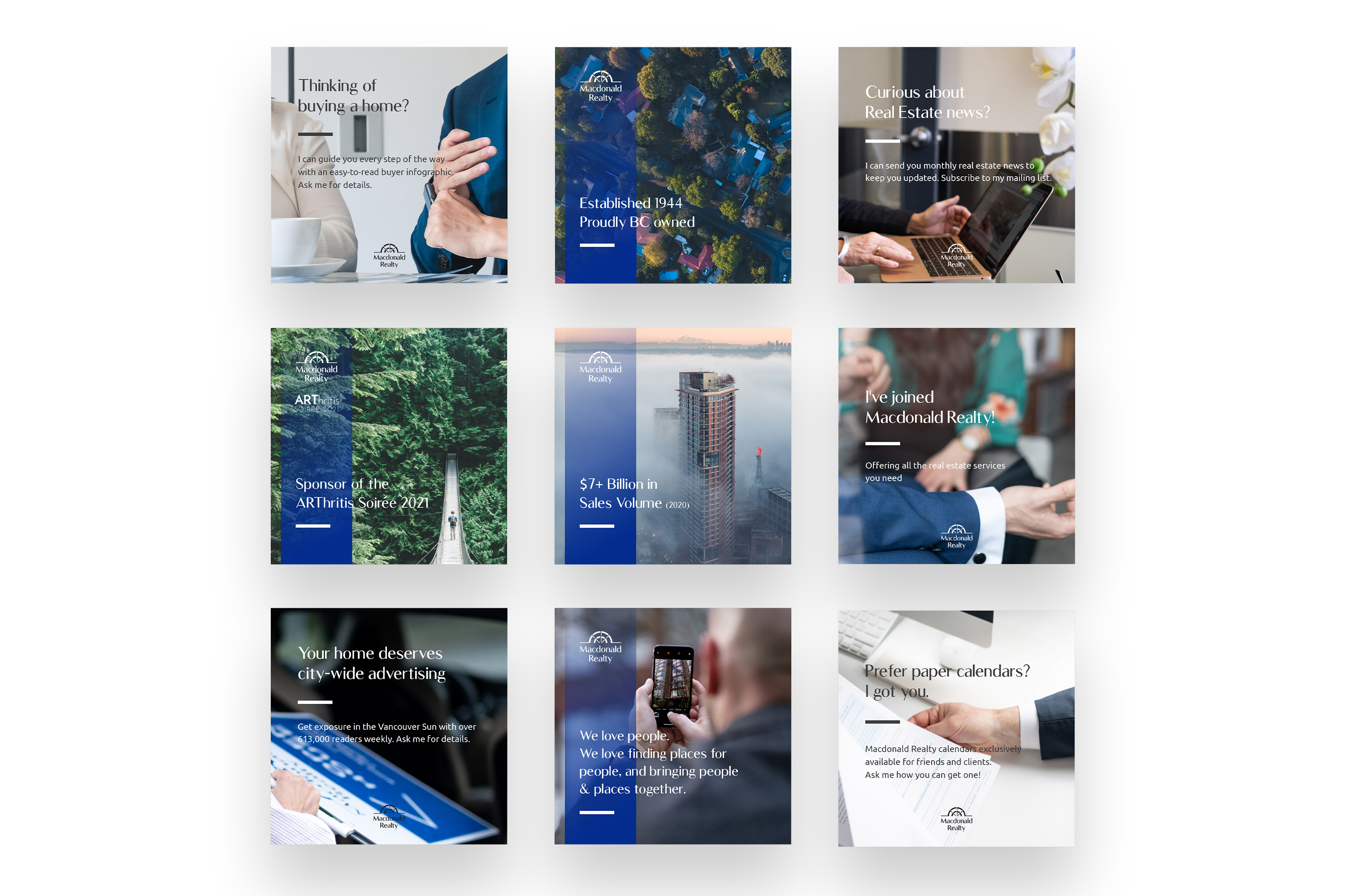 This social media toolkit is specifically designed for Macdonald Realty agents, empowering them to become effective brand ambassadors. It provides a straightforward starting point for agents new to social media, offering clear guidance. Additionally, it enables agents to proudly showcase their association with a reliable and reputable real estate company to their clients.