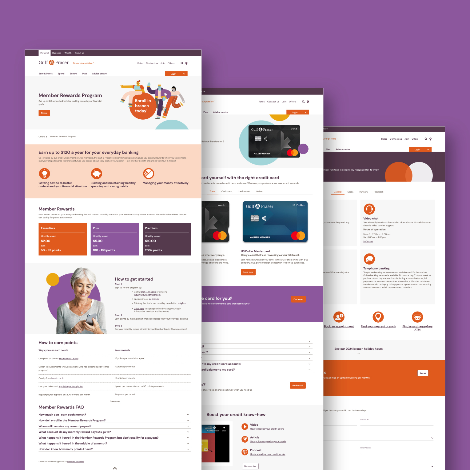 The Gulf & Fraser website serves as an important digital platform for members to access information about promotions, the latest news, and online banking services. Following our rebrand, my team and I collaborated with Central 1 (our credit union partner) to completely redesign the website. During the early development stages, I liaised with our digital team to analyze data from the previous website and identify areas for improvement to enhance engagement.